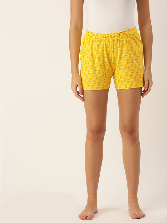 Women Yellow & Green Conversational Printed Cotton Shorts