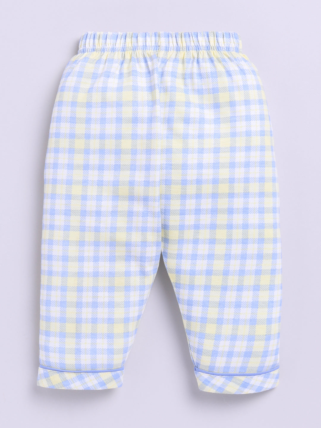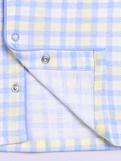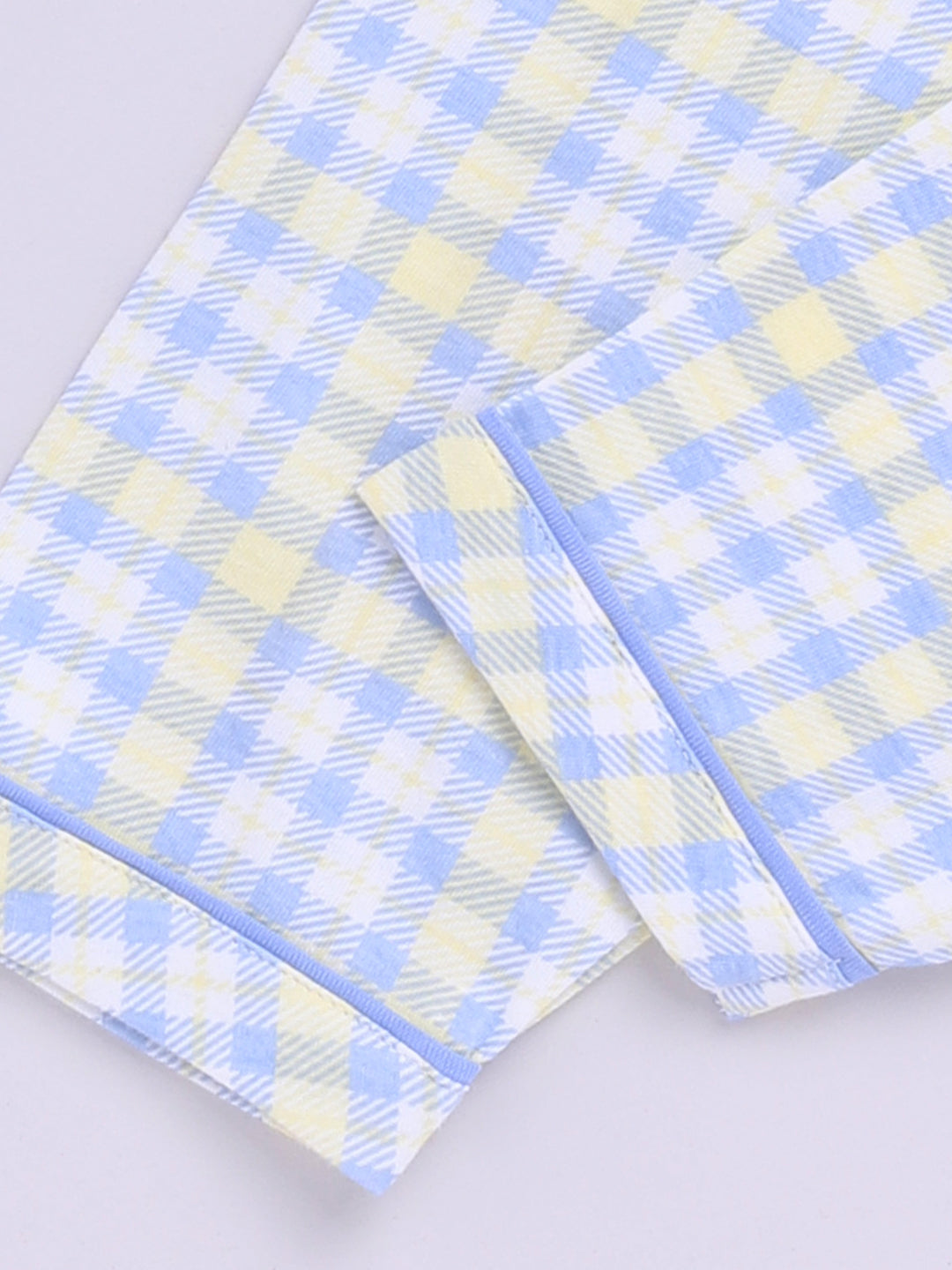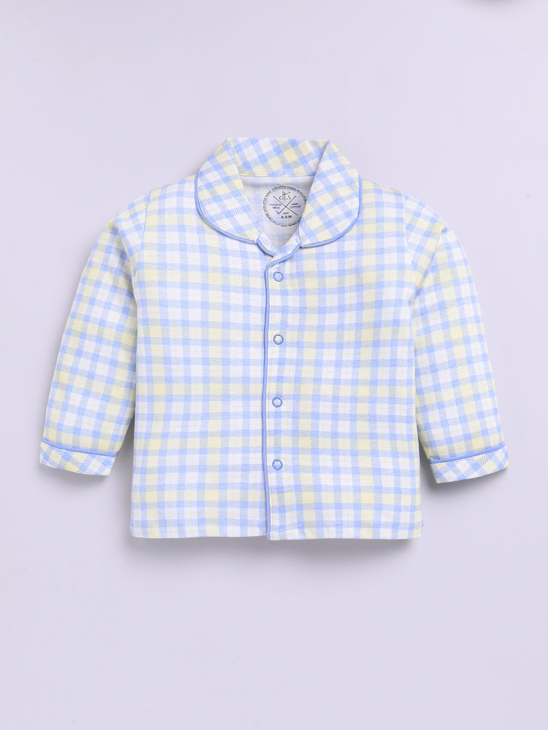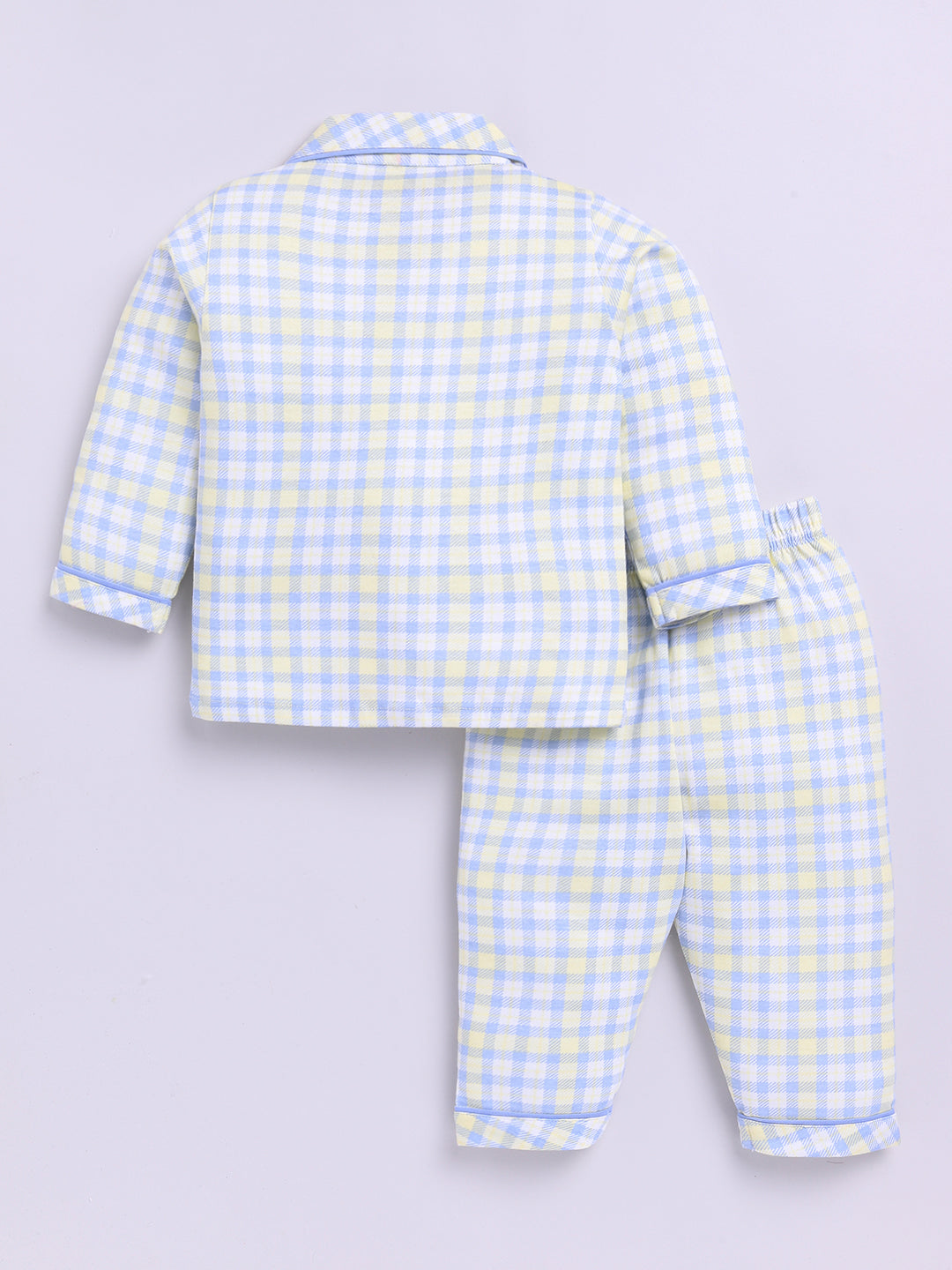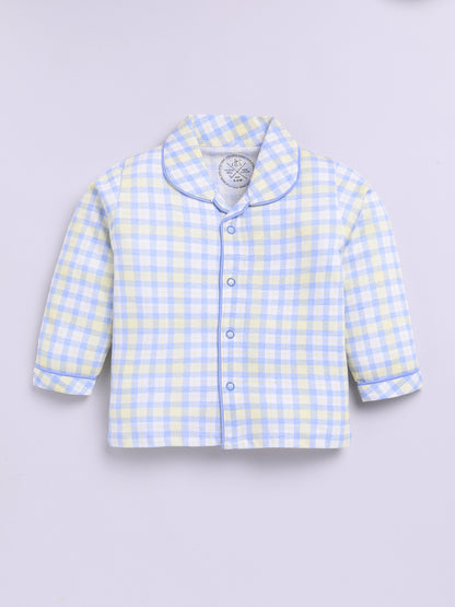 This summer nightwear set is made for warm nights and cool dreams. The soft cotton fabric is breathable and gentle, making it perfect for kids who need extra comfort while they rest. A relaxed fit and simple design make it an everyday favorite. This nightwear set has a Shirt Collar and a Checked print and is made of cotton Knit fabric