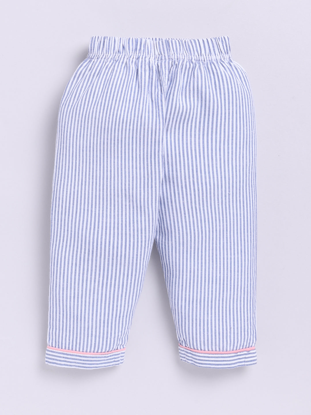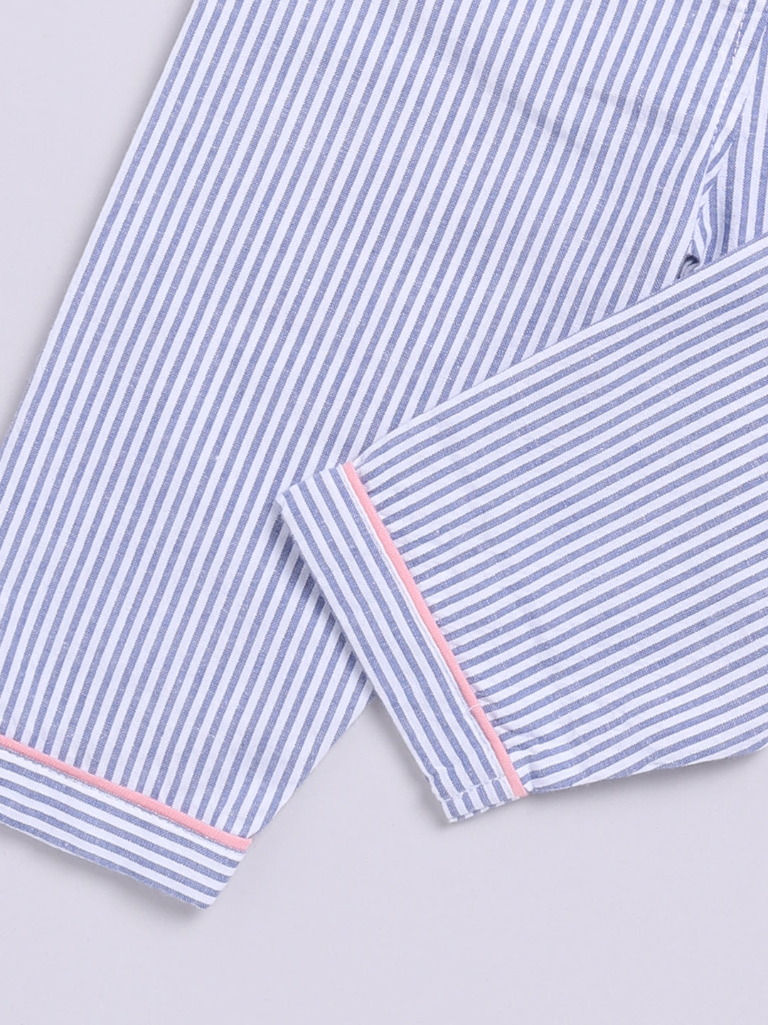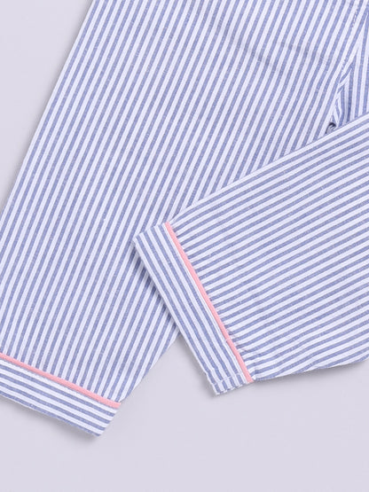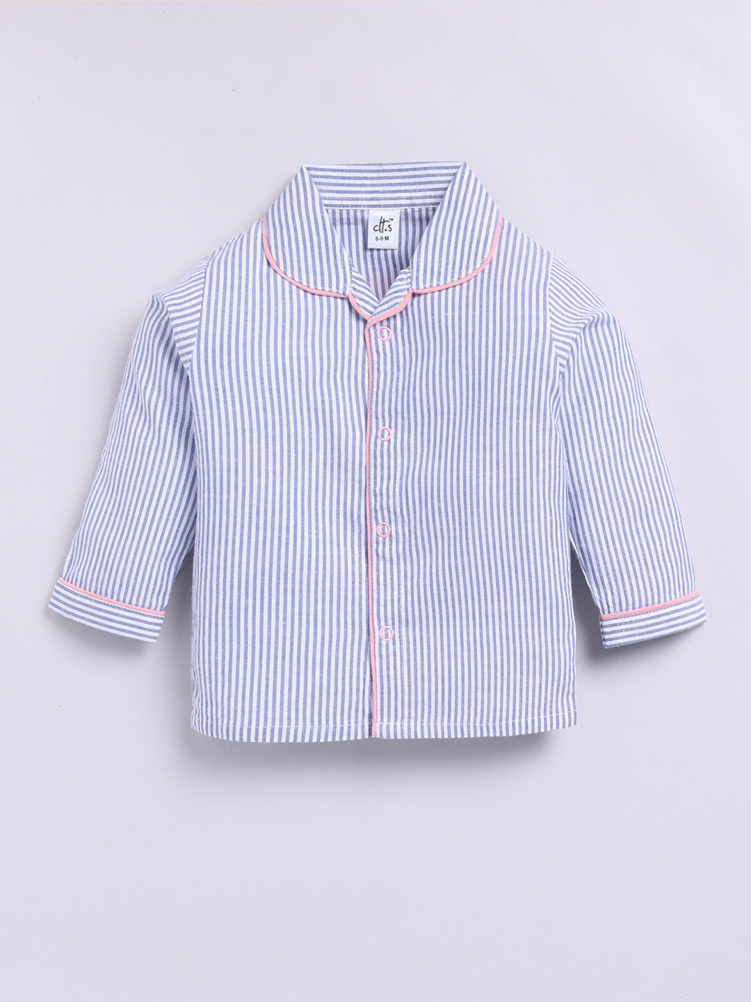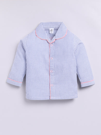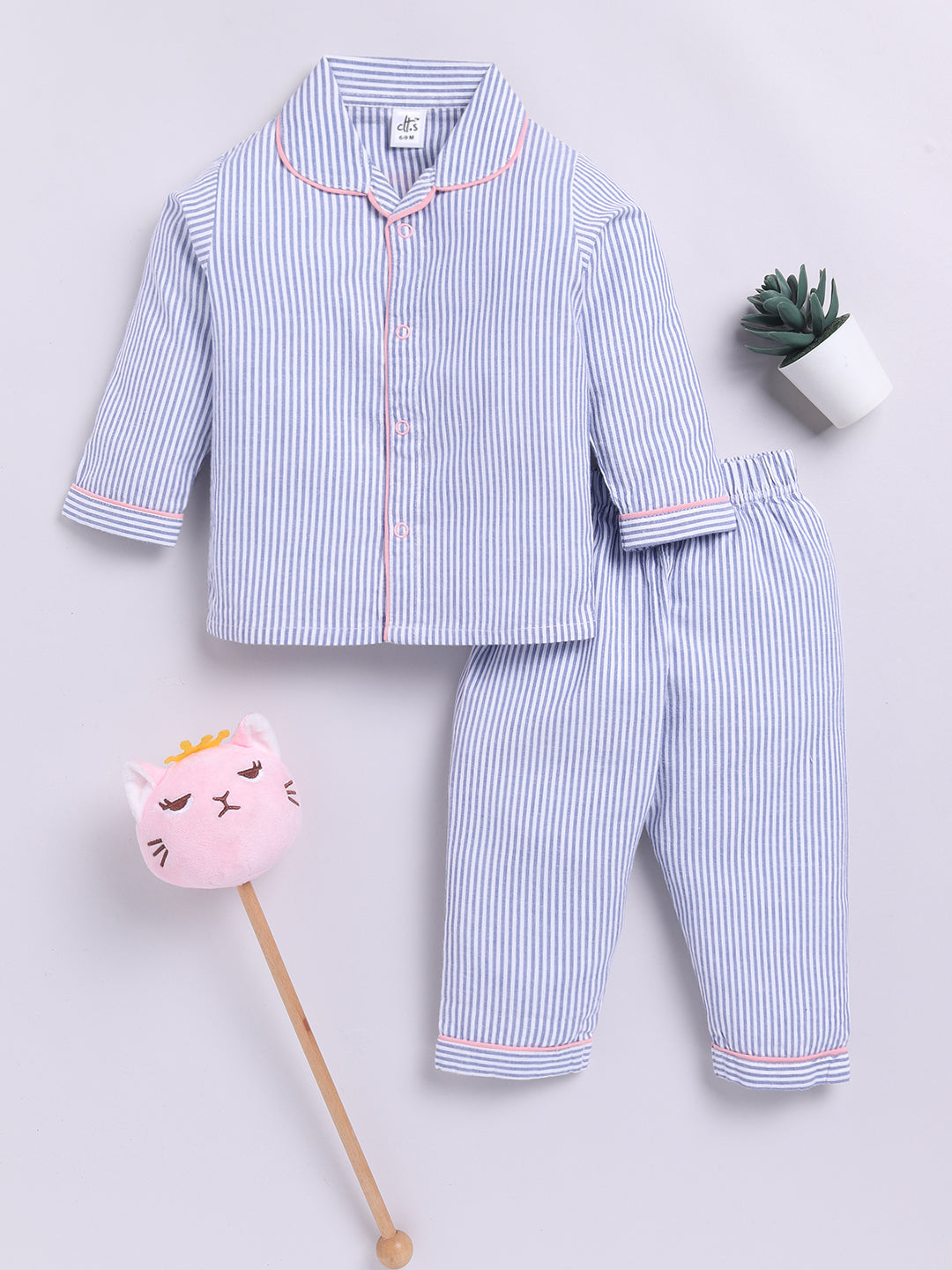 Wrap your little one in happy hugs with this cotton nightwear set. Its breathable, lightweight material keeps kids comfy even on the hottest nights. With playful prints and a relaxed fit, it’s just right for bedtime fun and midnight dream-hopping. Comfort meets charm in every stitch. This nightwear set has a Shirt Collar and a Striped print and is made of cotton Woven fabric