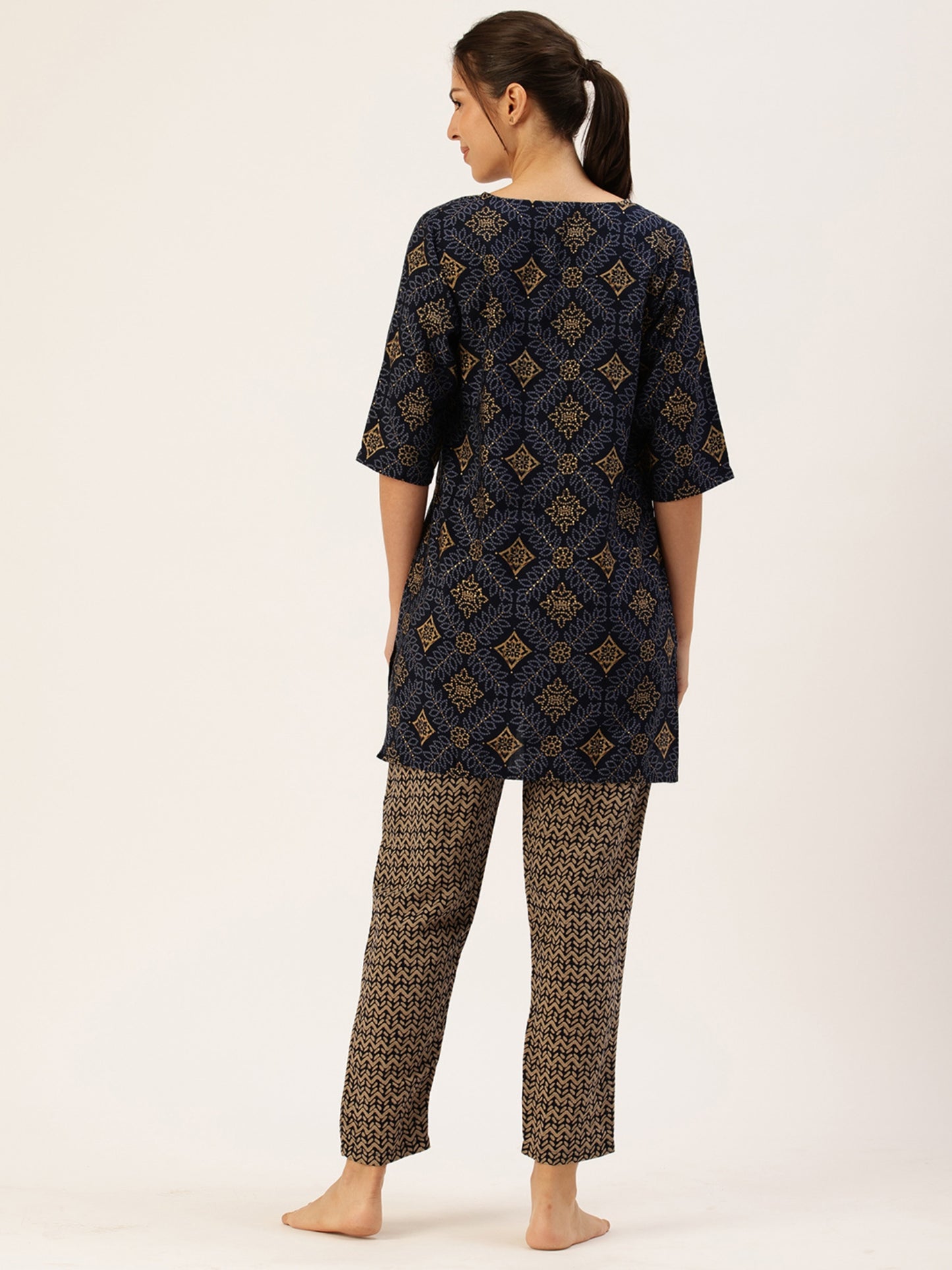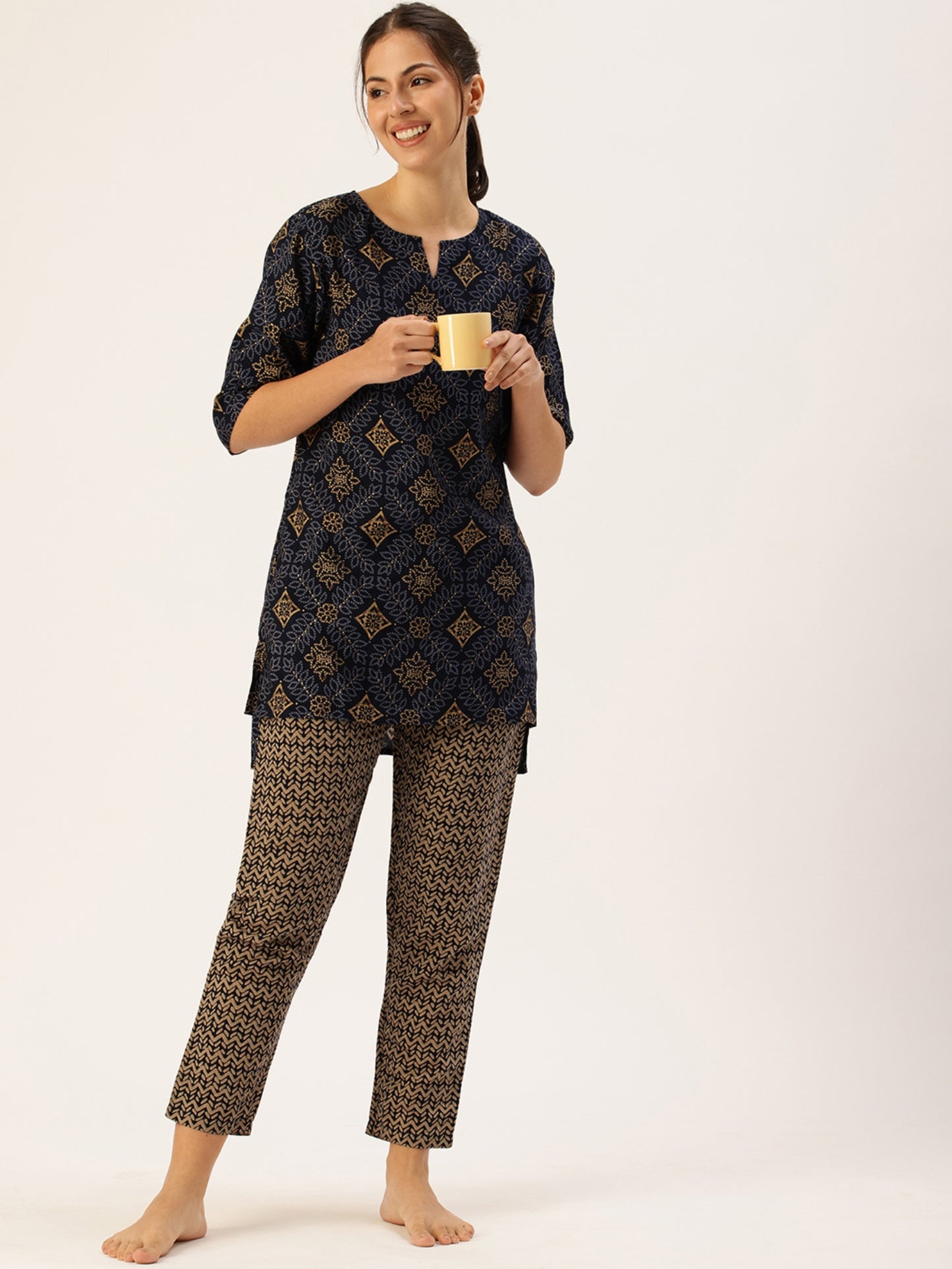 Introducing Blue Floral Kurta & Pyjamas made of Rayon. It has round neck and Three-Quarter Sleeves. This set is perfect for lounging, sleeping, or casual gatherings. Versatile and chic, this ensemble combines comfort with a touch of luxury.