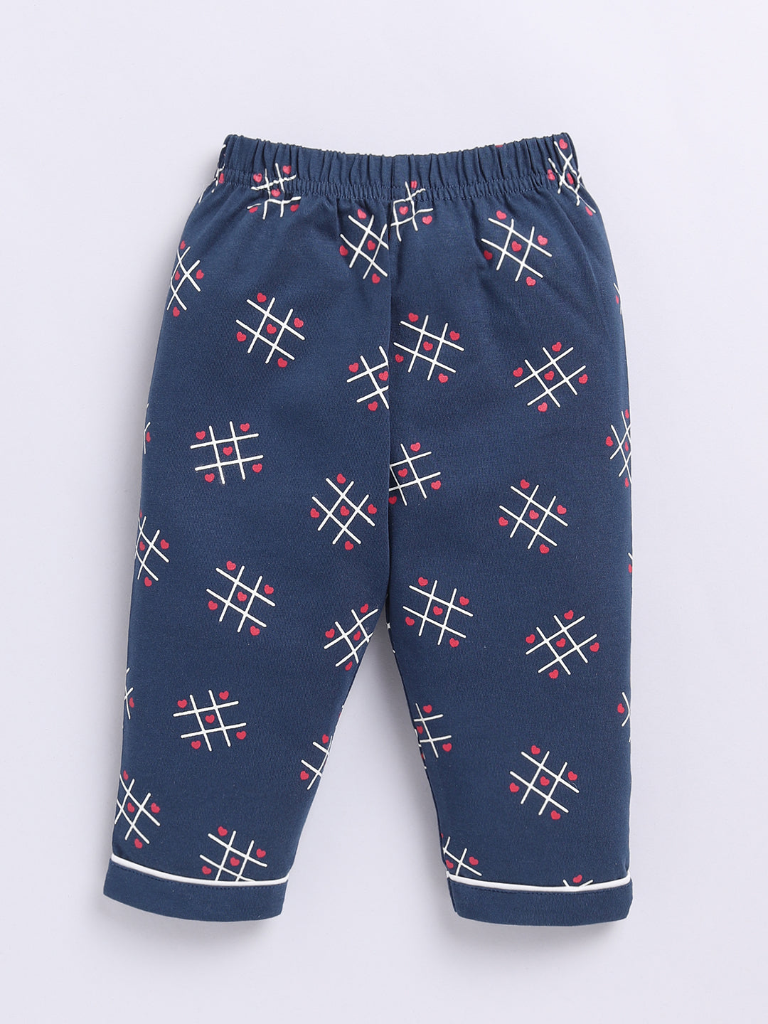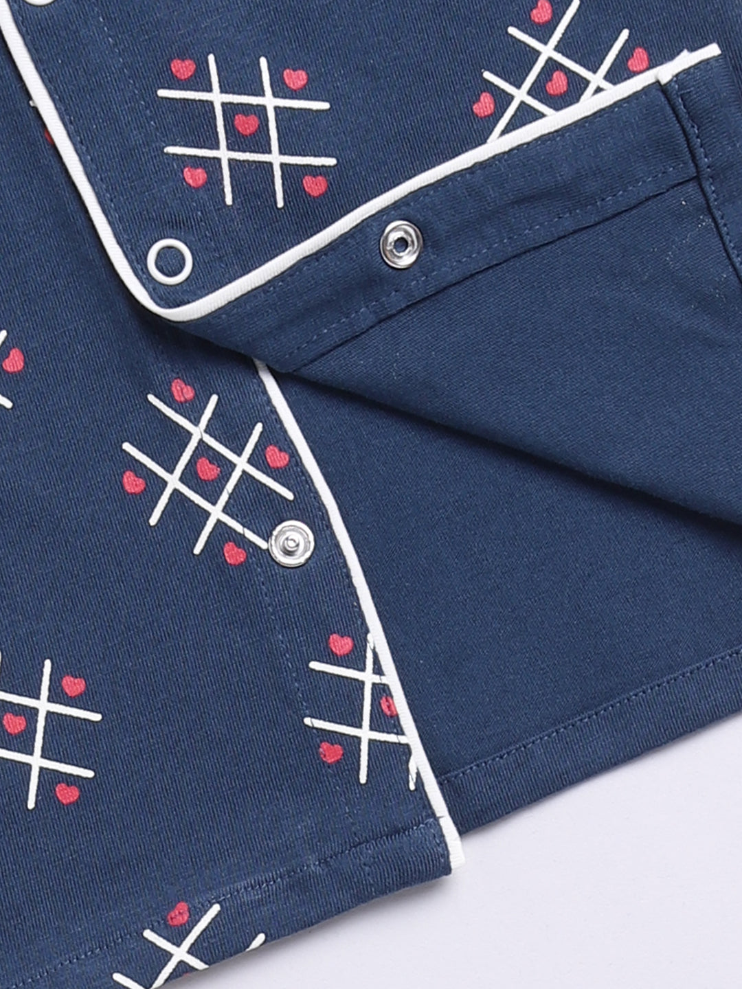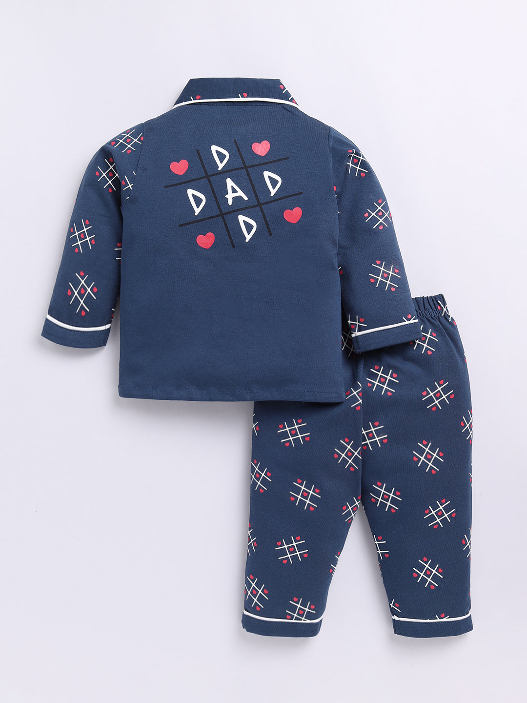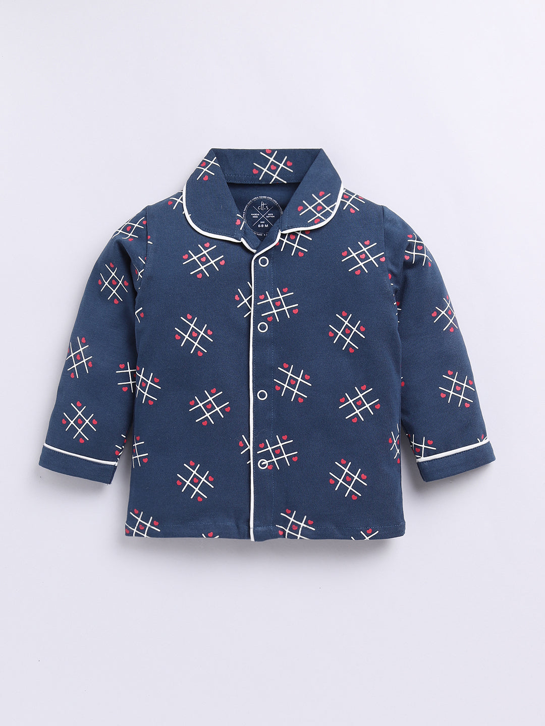Gentle on Skin: Made from fabric that’s gentle on the skin, this kids' nightwear set ensures a comfortable, irritation-free sleep. Perfect for peaceful nights. The Blue Full sleeve Night Suit is made of 100% Cotton and has a Shirt Collar with Graphic print