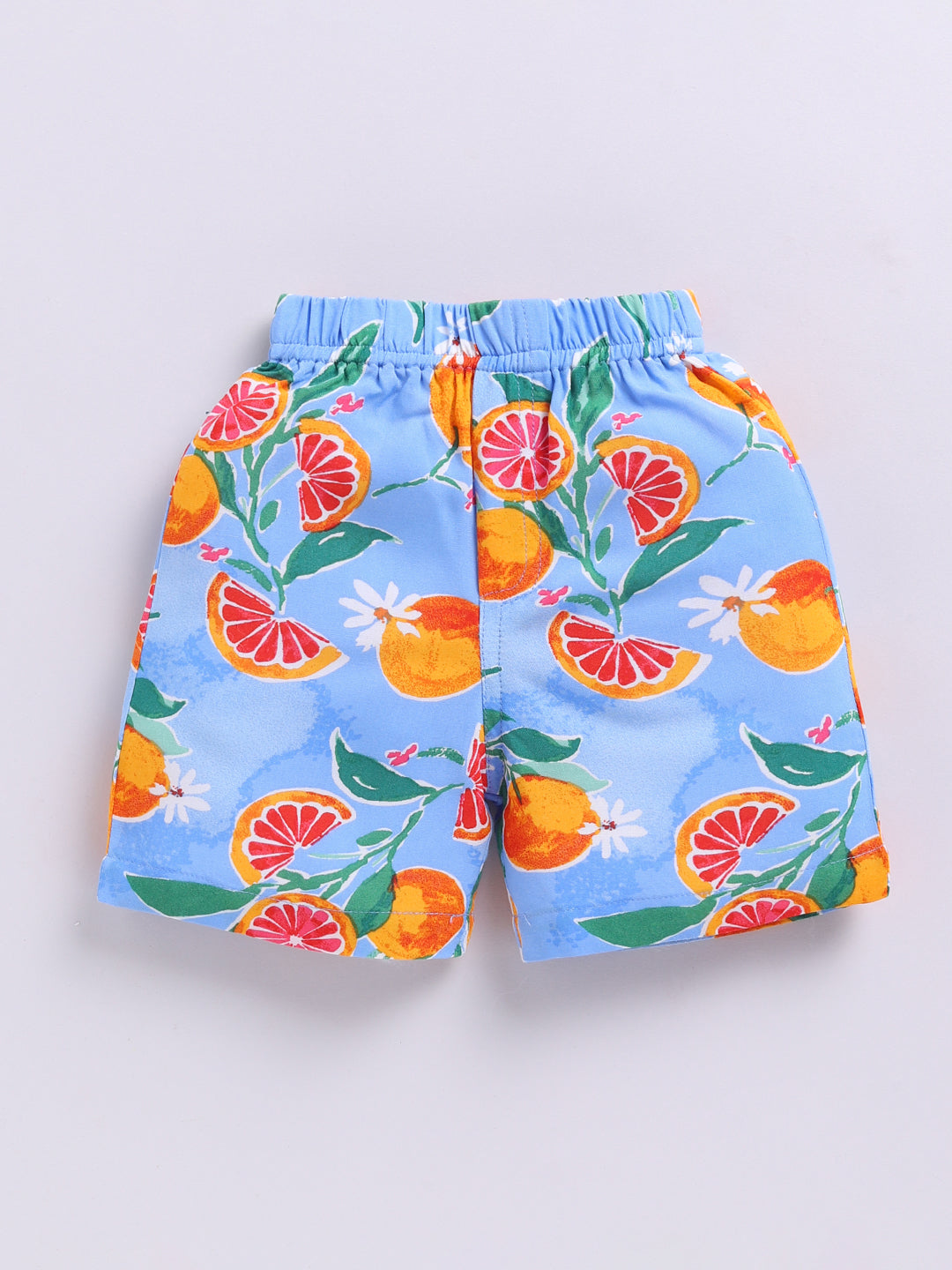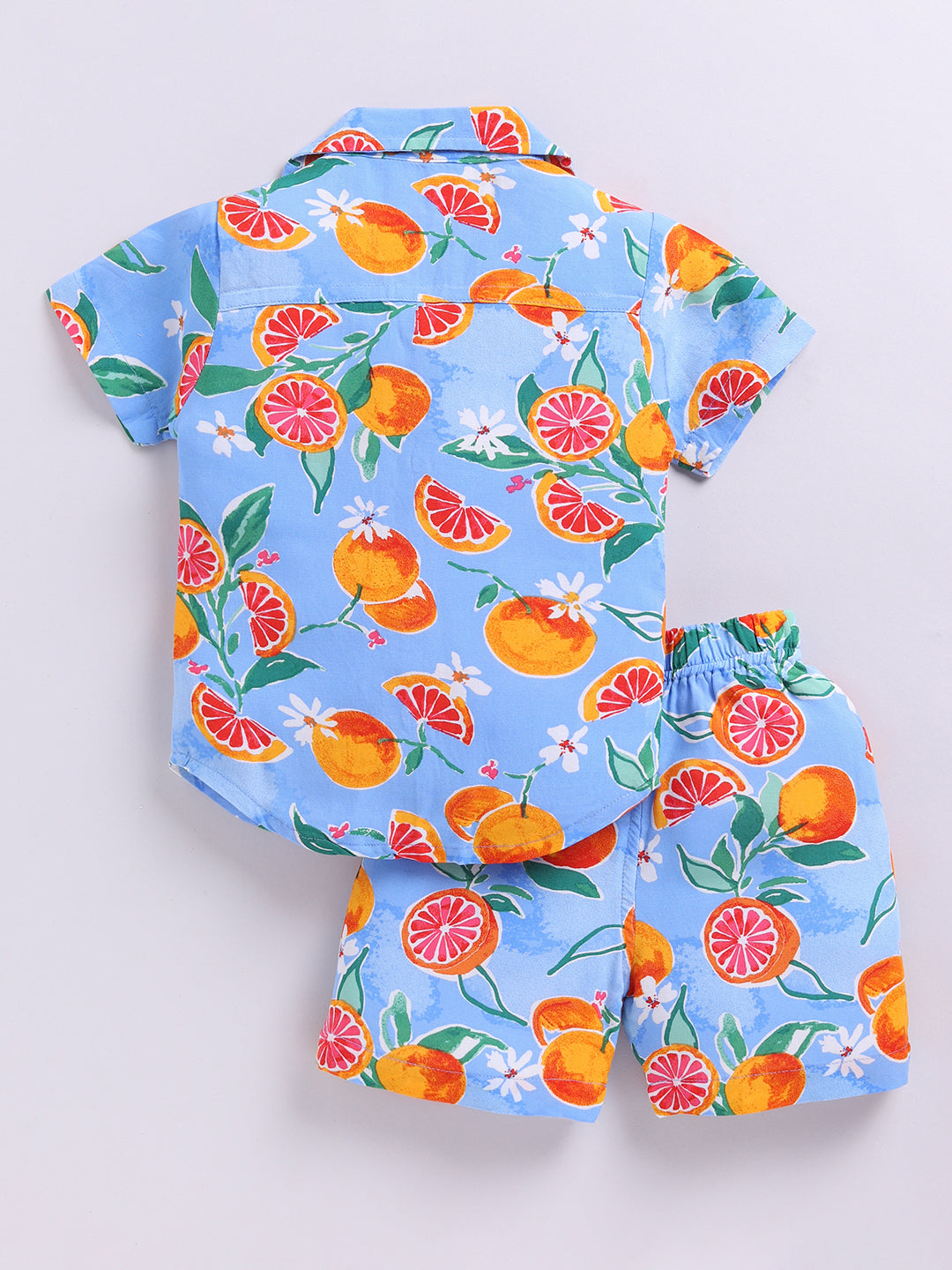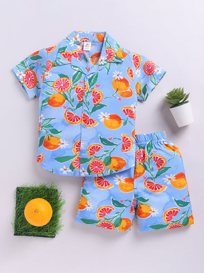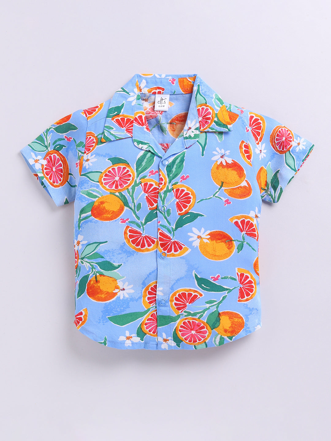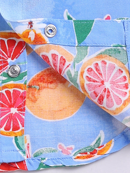 Sunshine Ready: Beat the heat in this breathable cotton outfit! Perfect for outdoor play, its soft fabric ensures all-day comfort while the bright design adds a fun summer touch. The co-ord set has Shirt Collar and Short Sleeves in a Tropical print