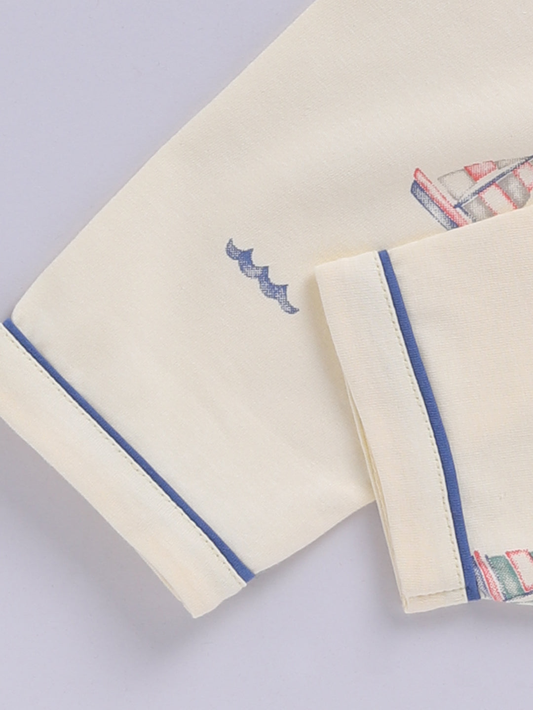 Designed for pure comfort, this nightwear set is crafted from premium cotton that feels soft against delicate skin. The relaxed fit ensures freedom to move while sleeping, keeping kids cool, cozy, and content all night. Made from 100% Cotton, the night suit features a Graphic print and has a Shirt Collar and Long Sleeves