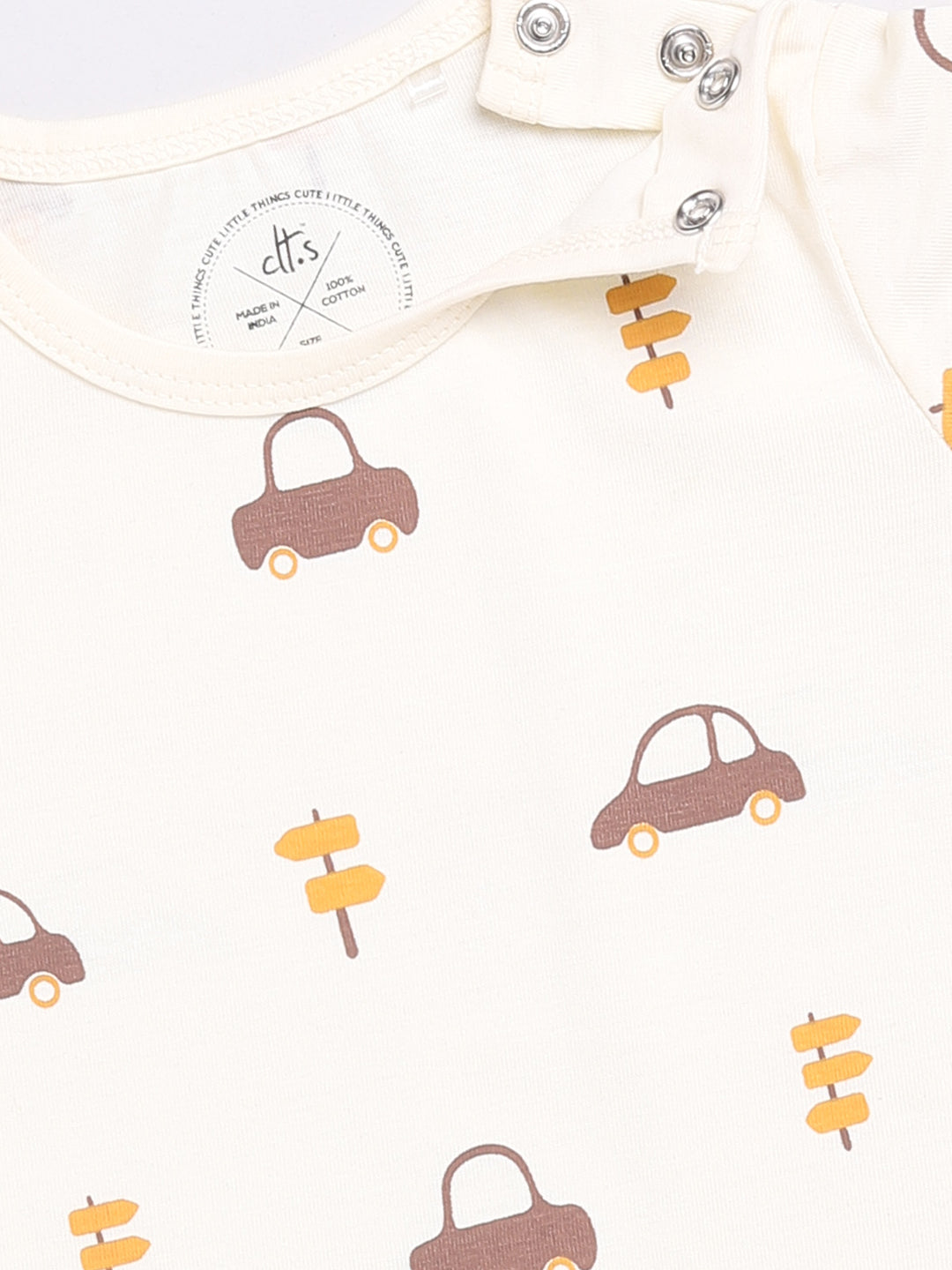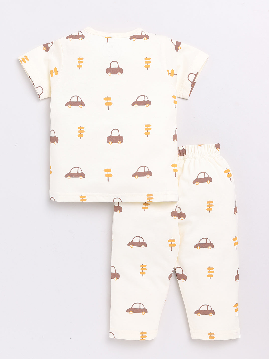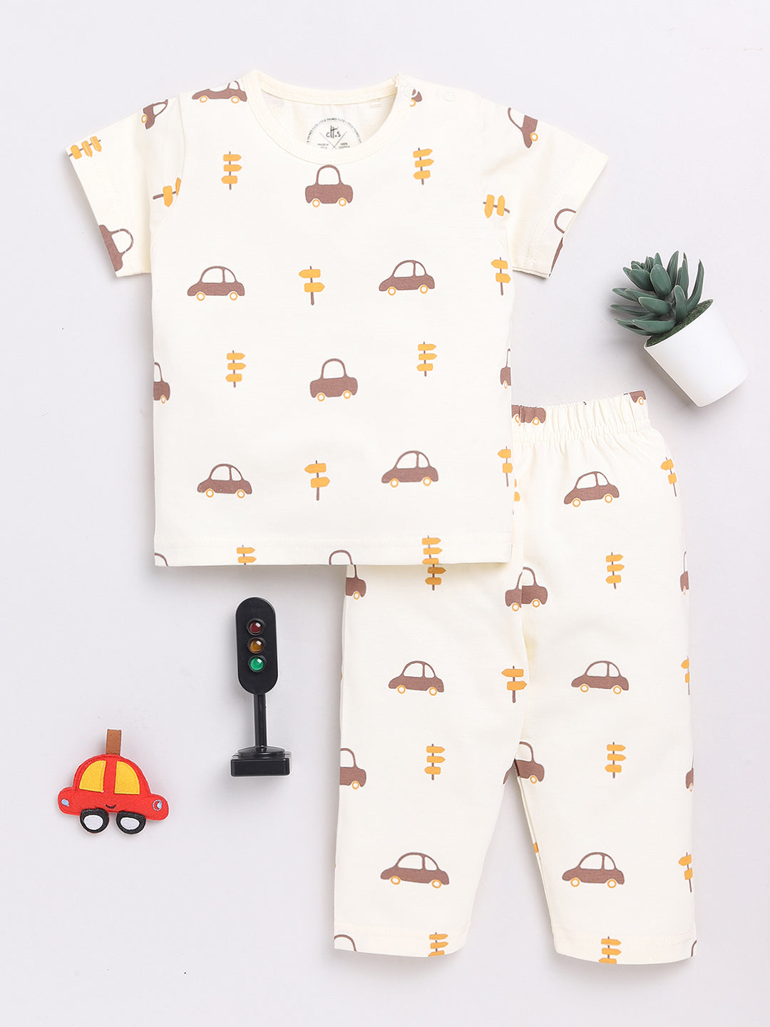Introducing the Car print 100% Cotton Night Suit by CLT.S, where comfort meets adventure for your little explorer's bedtime journey! Designed for ages 3 months to 3 years, this unisex ensemble combines softness with style effortlessly. Crafted from premium cotton, it ensures cozy nights and peaceful slumbers. Adorned with charming car prints, it sparks imagination and adds a playful touch to bedtime rituals. Let your child embark on dreamy adventures in utmost comfort and cuteness. Elevate their sleepwear collection with CLT.S, the epitome of cuddly charm and adorable fashion, ensuring every bedtime is filled with sweet dreams and joyful moments!
