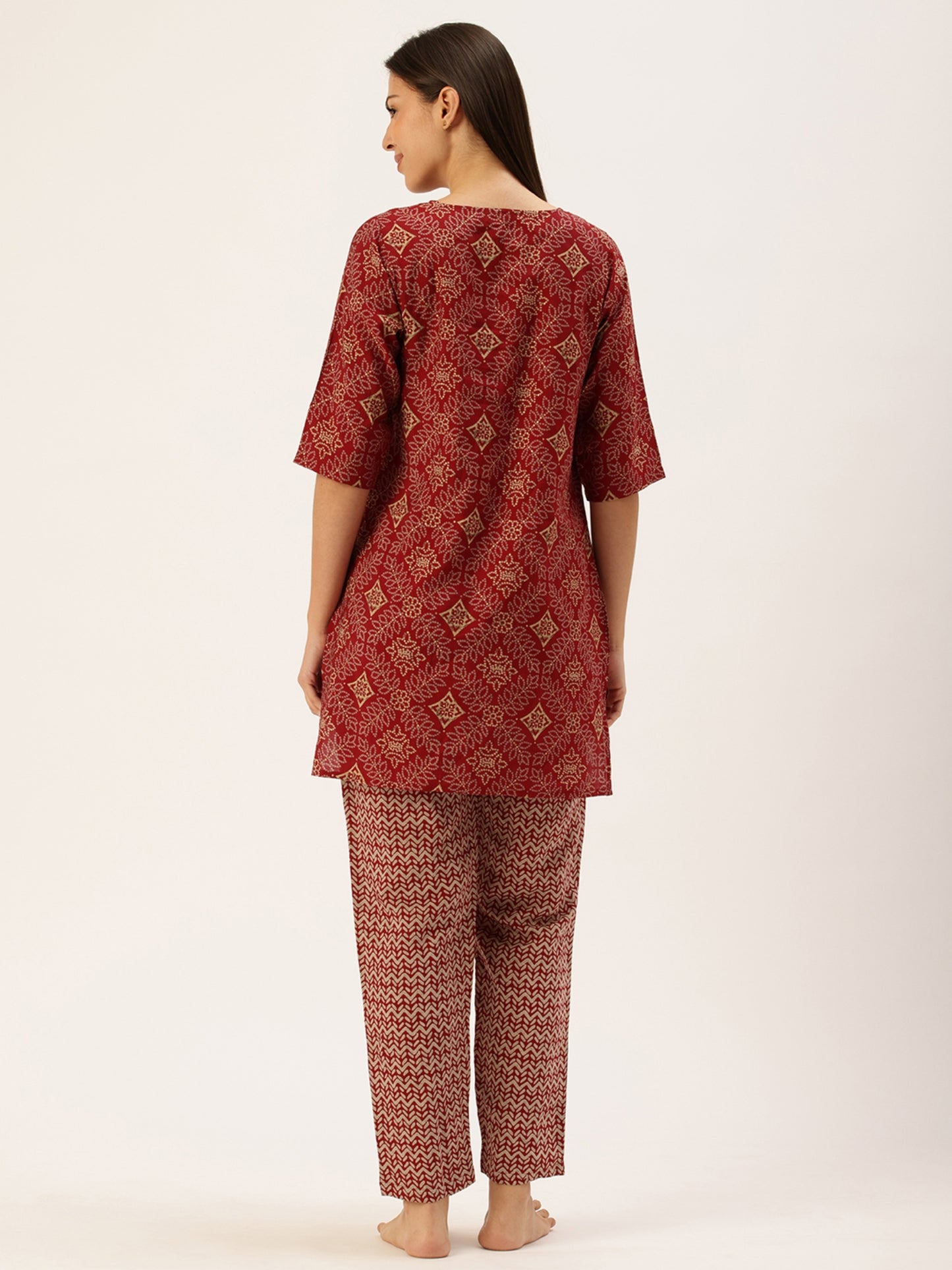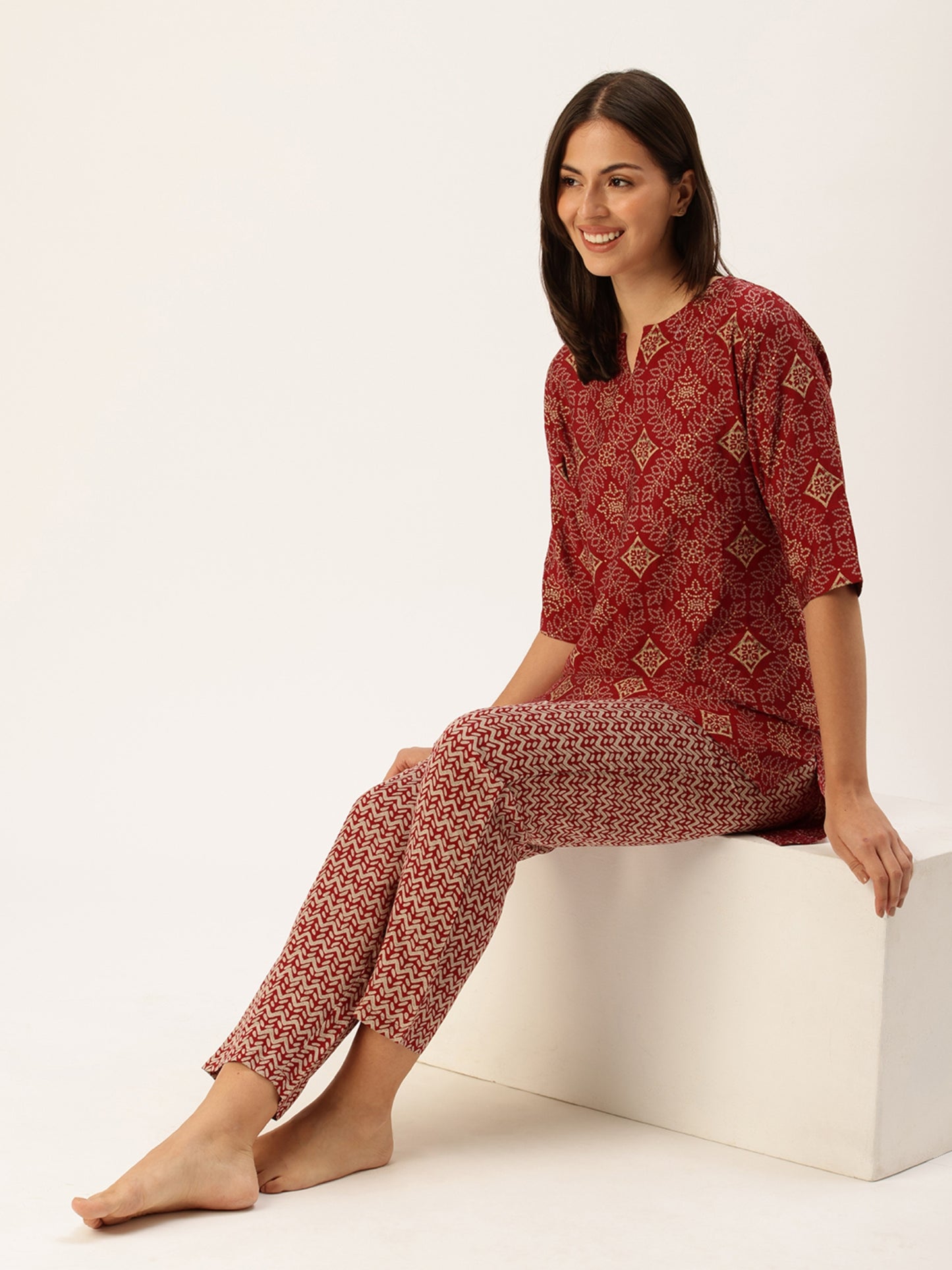 Introducing Blue Floral Kurta & Pyjamas made of Rayon. It has round neck and Three-Quarter Sleeves. This set is perfect for lounging, sleeping, or casual gatherings. Versatile and chic, this ensemble combines comfort with a touch of luxury.