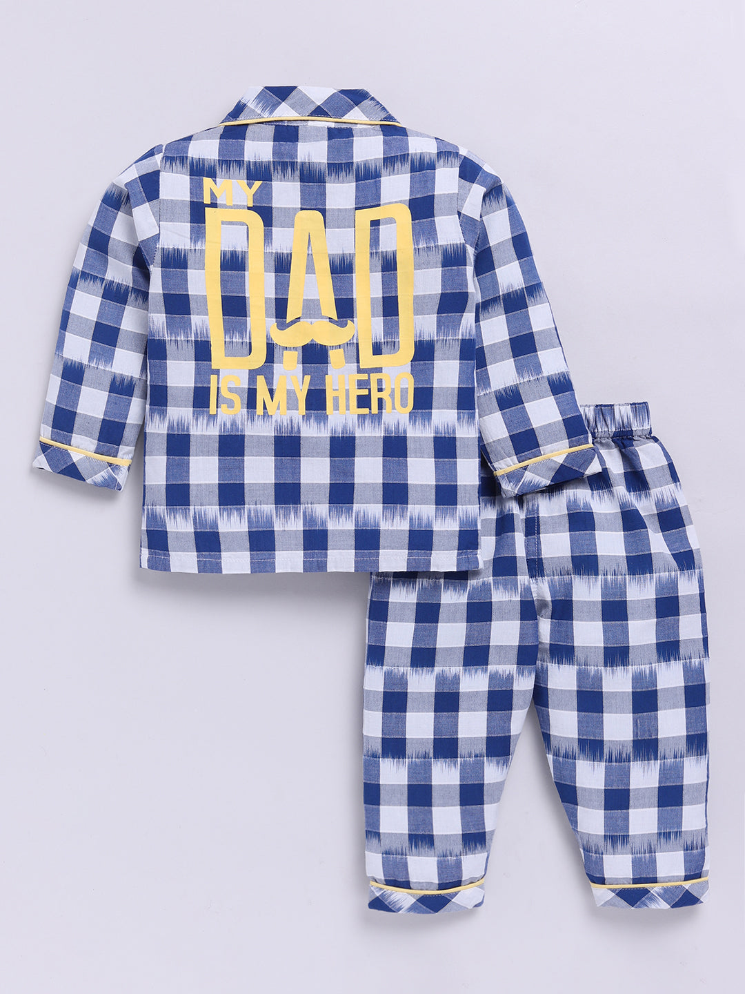 " My Dad is My Hero" Limited Edition Blue Checkered Typography Full Sleeve Night Suit