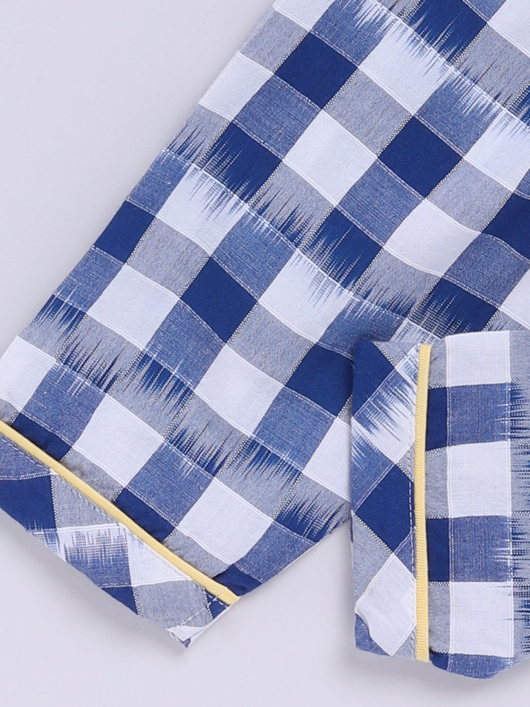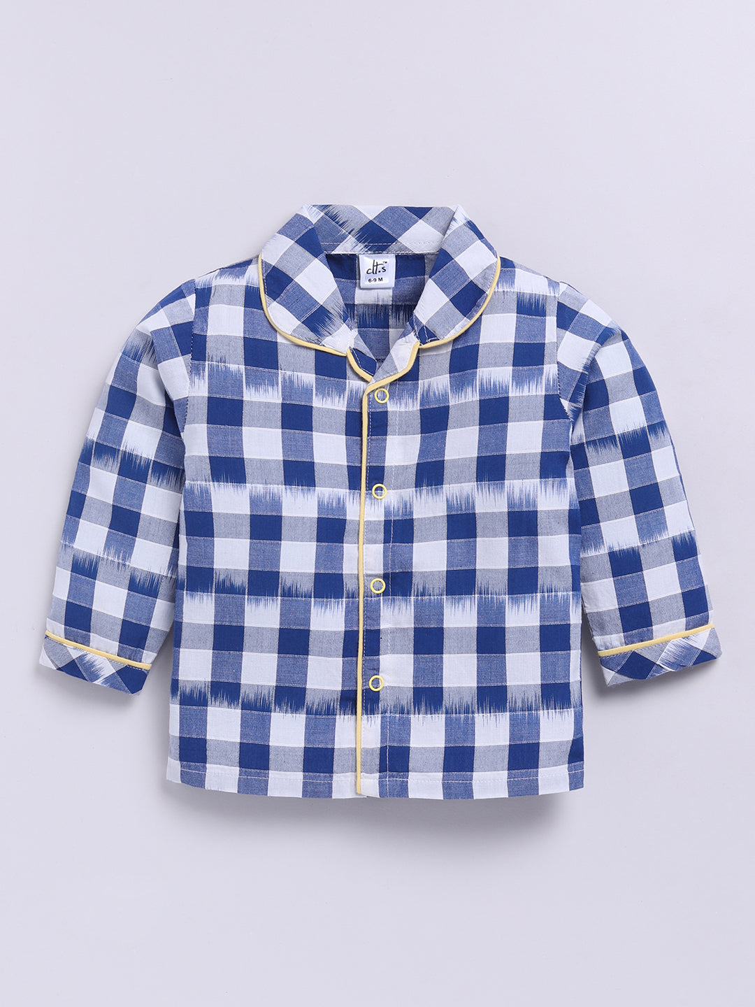 A cotton nightwear set in lively colors with attractive checks. The fabric is soft, breathable, and designed for playful family nights. Its checkered pattern makes it a joyful and functional bedtime option. Full Night Suit for kids in Pure Cotton with Shirt Collar, Long Sleeves, and Pyjamas.