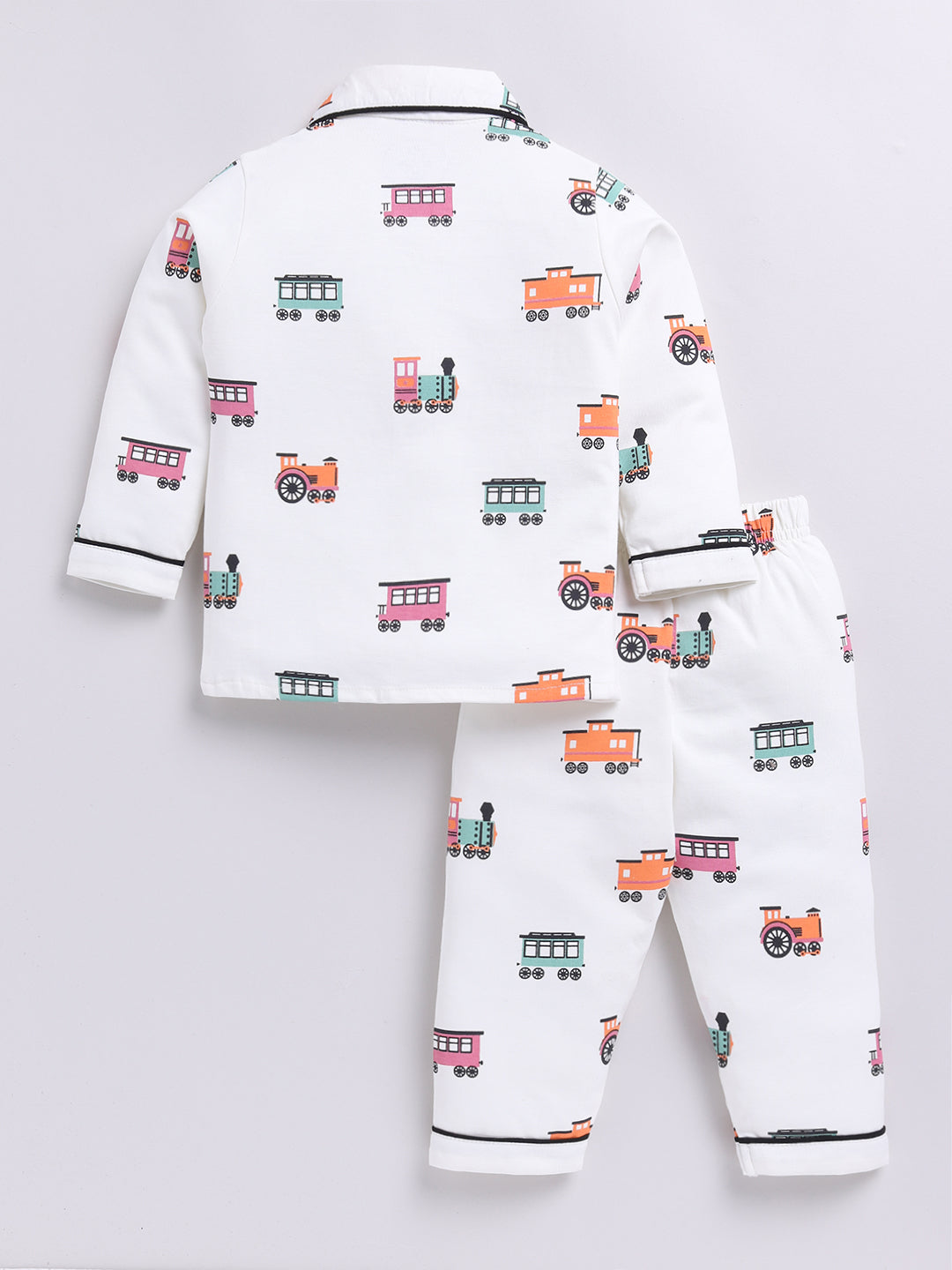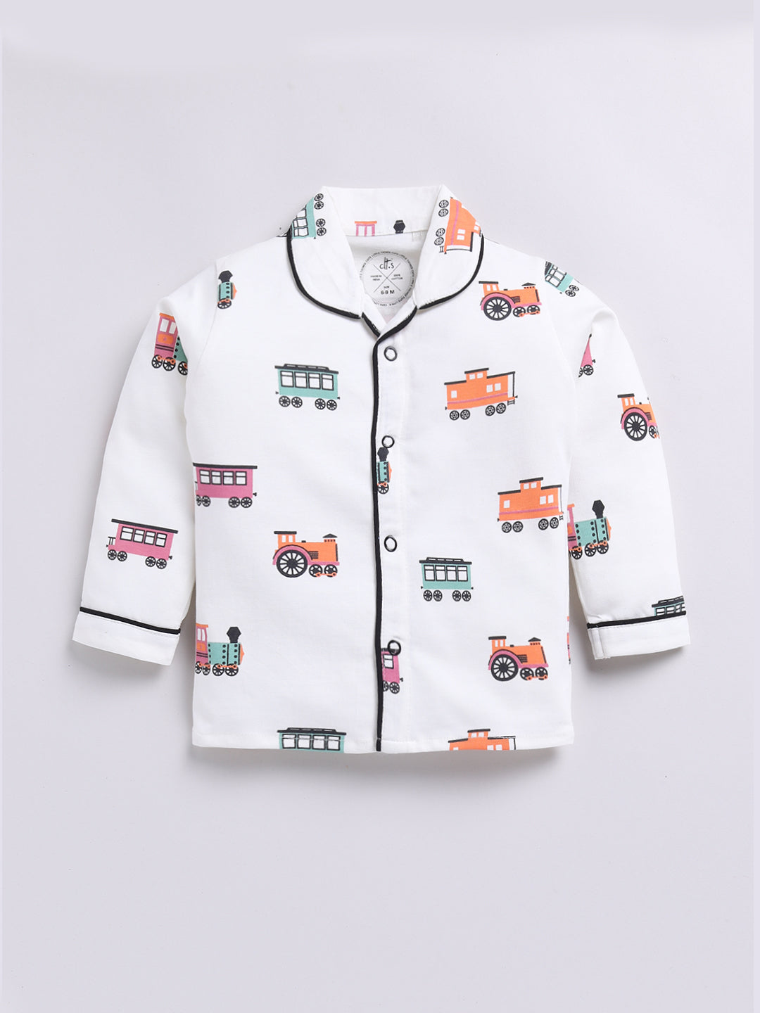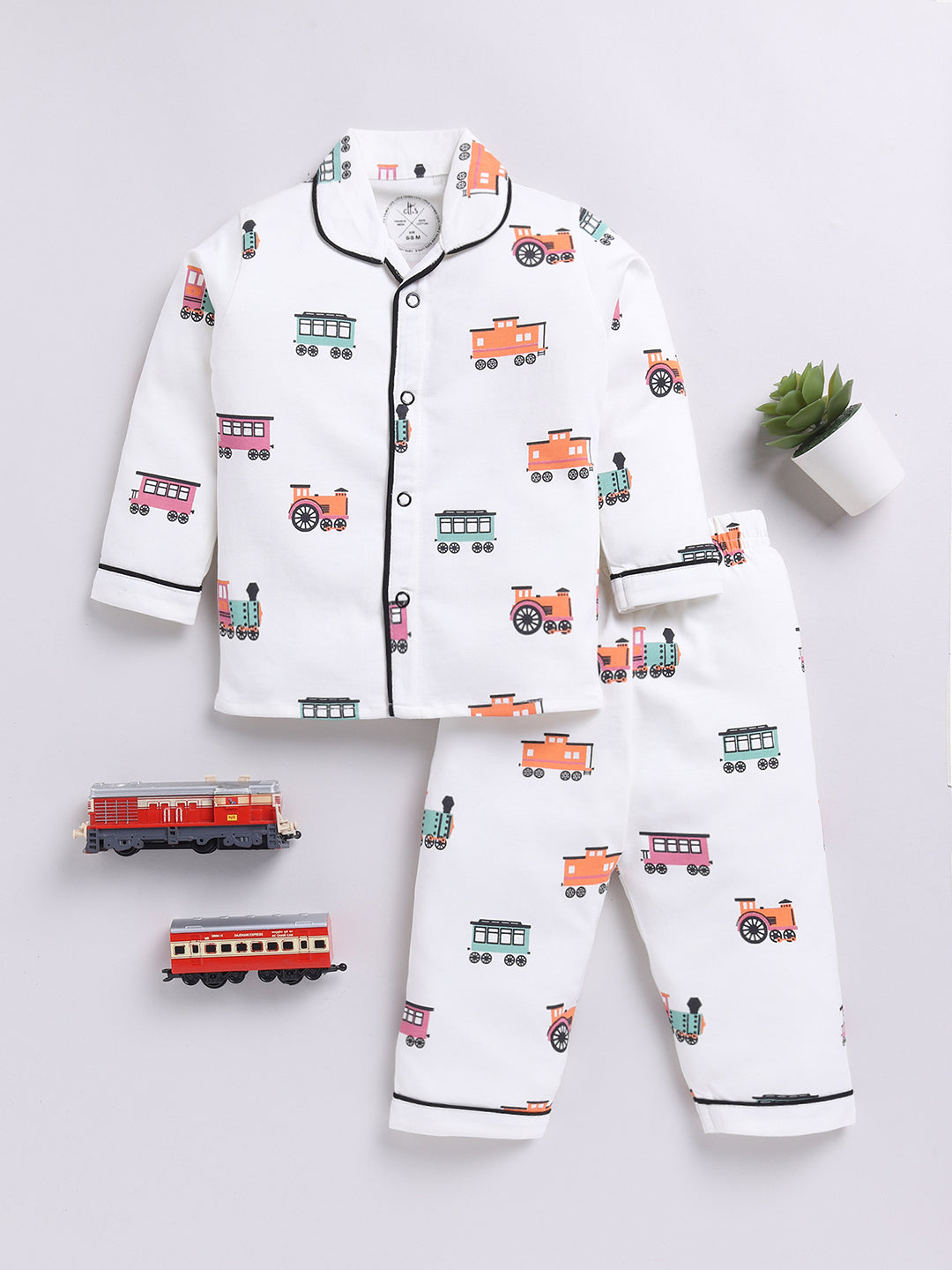 Fun and Functional: Keep bedtime fun with this functional nightwear set. Featuring playful prints and soft fabric, it ensures comfort and style for your child. The Sea Green Full sleeve Night Suit is made of 100% Cotton and has a Shirt Collar with Graphic print