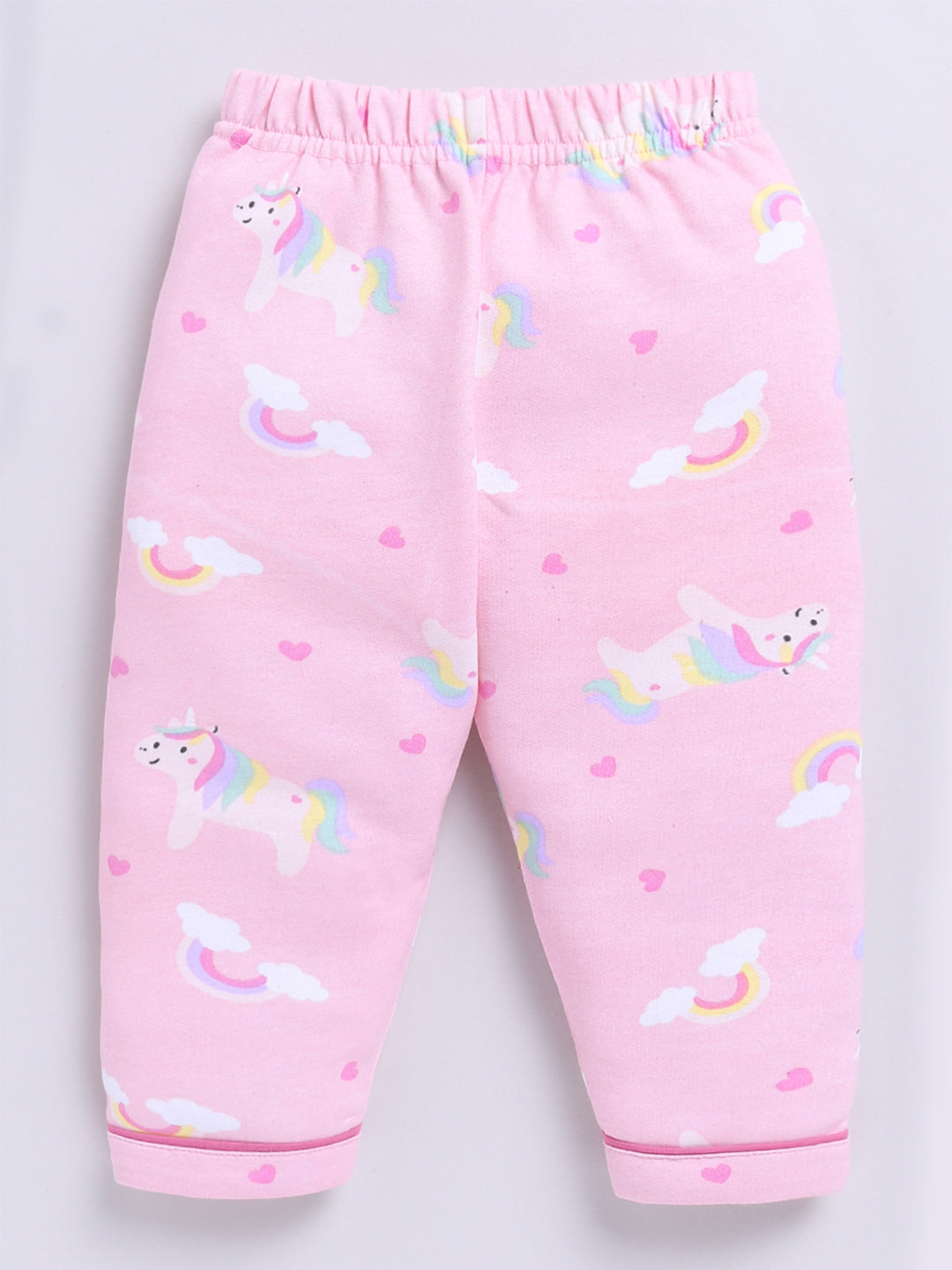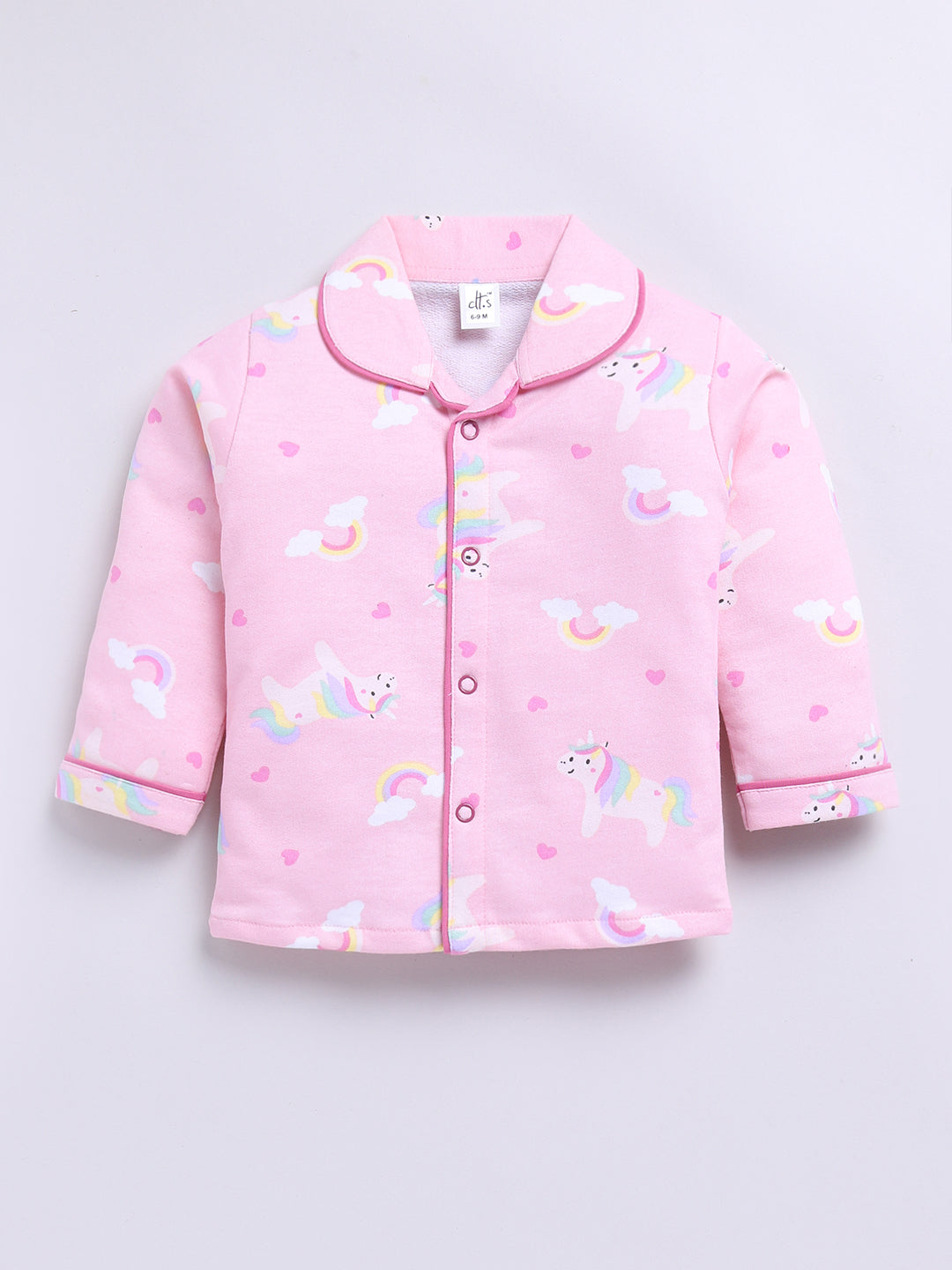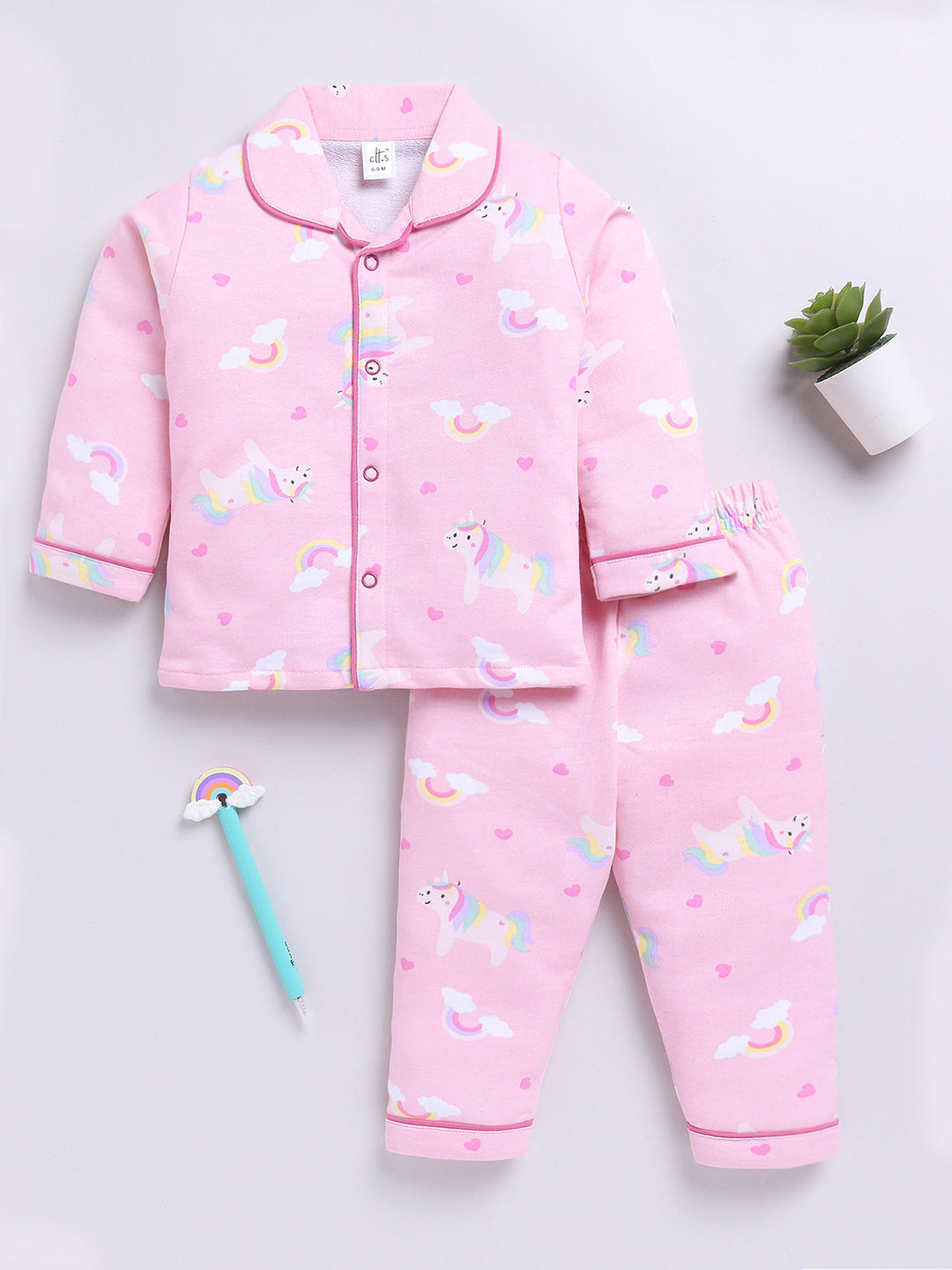 Playful and Cozy: Bring fun to bedtime with this playful, cozy nightwear set. Made from breathable fabric, it keeps your child comfortable all night long. The Pink Full sleeve Night Suit is made of 100% Cotton and has a Shirt Collar with Animal print