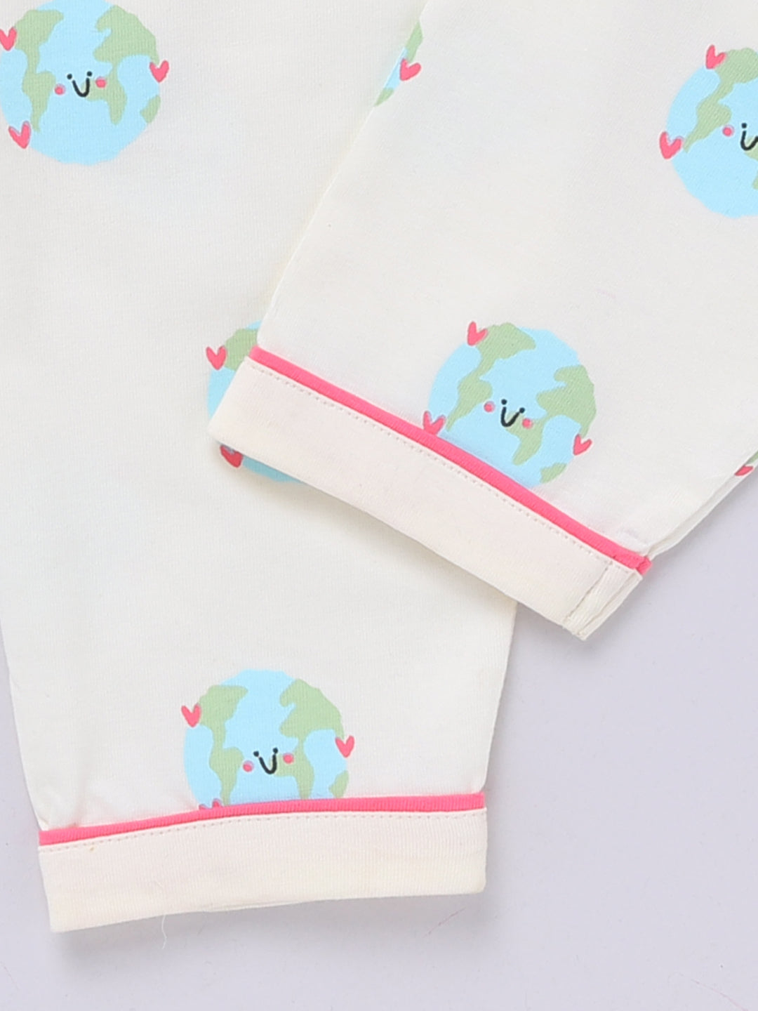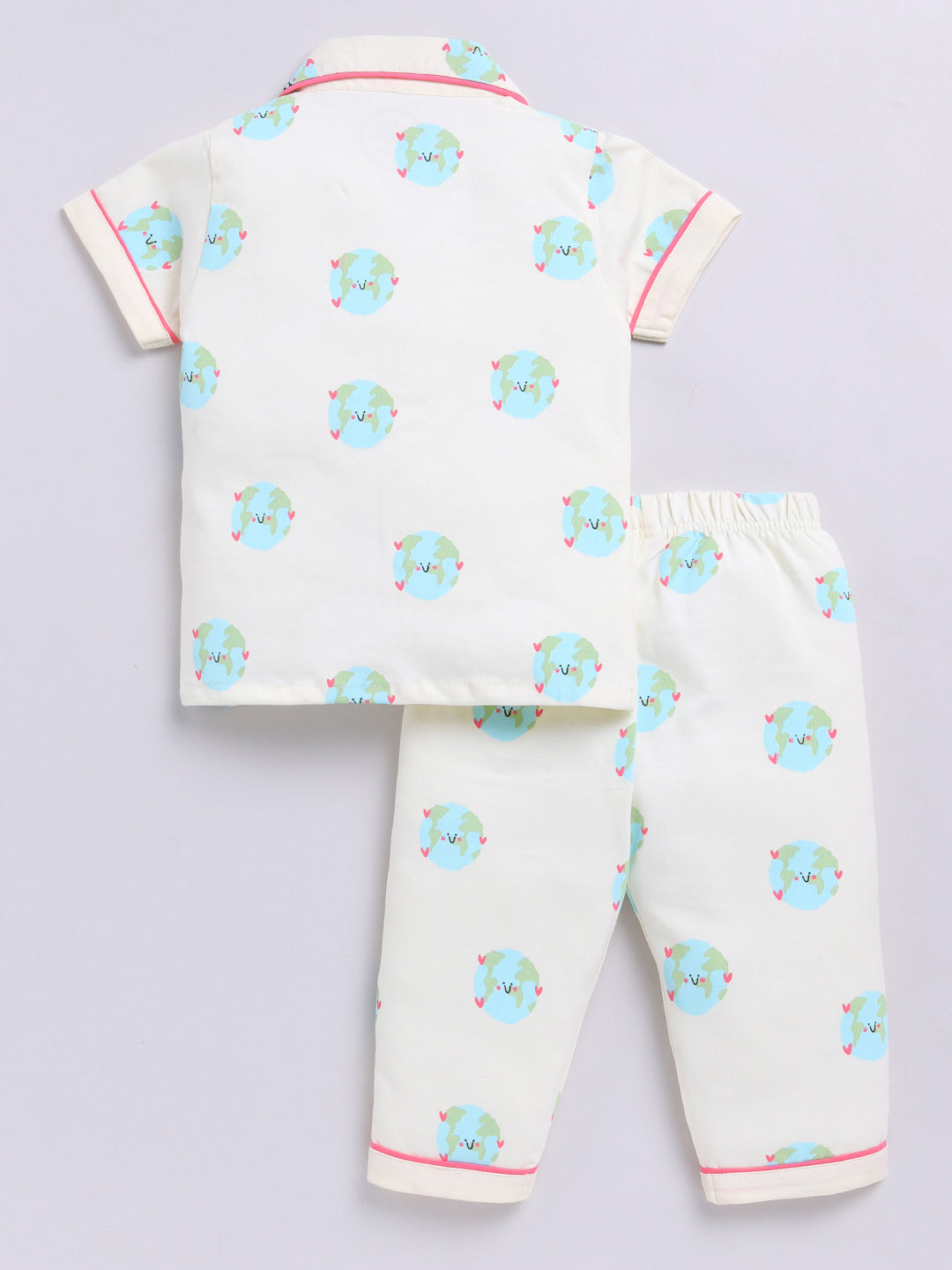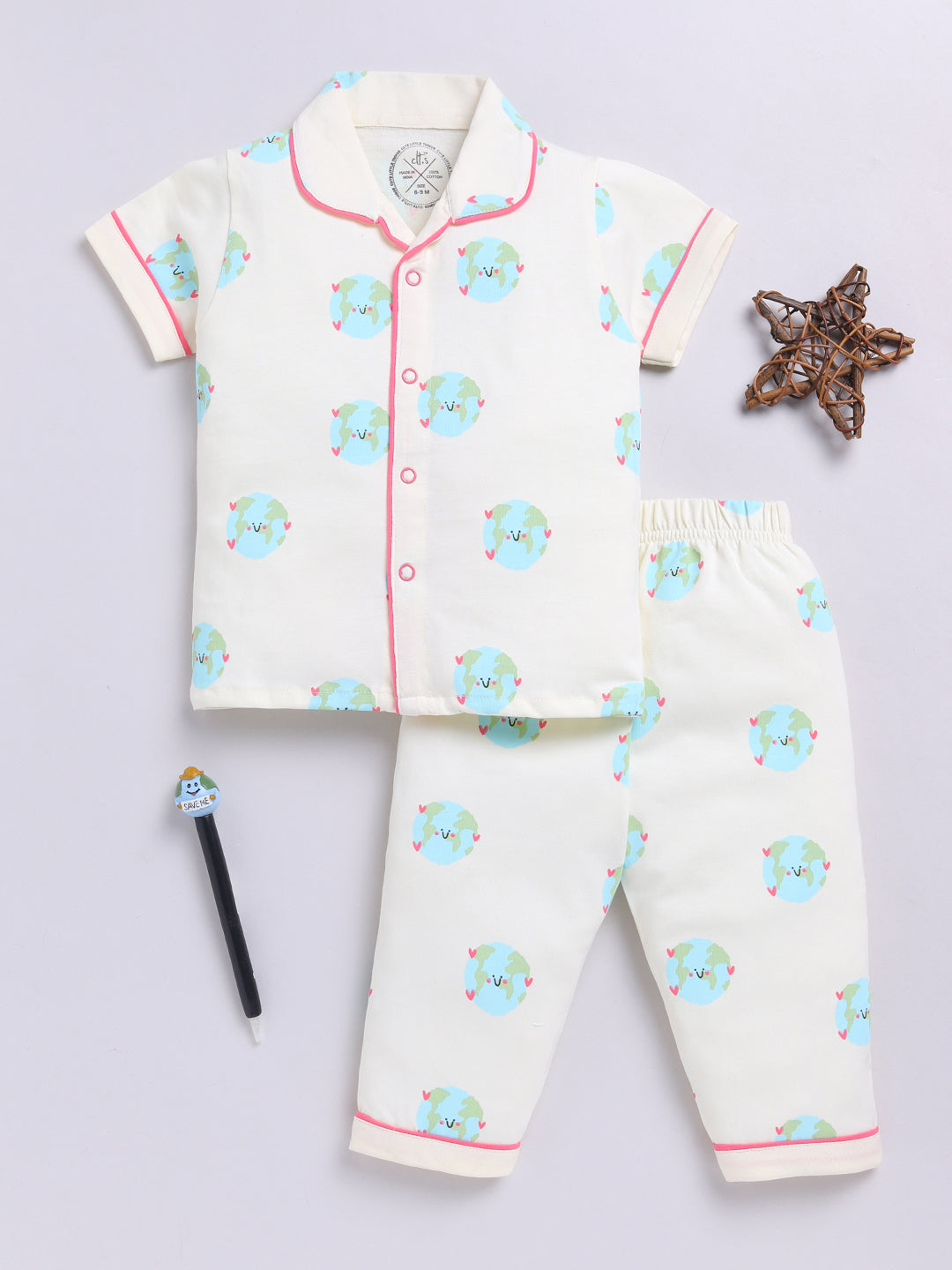 Planets Cream Cotton Half Sleeves Nightwear Set