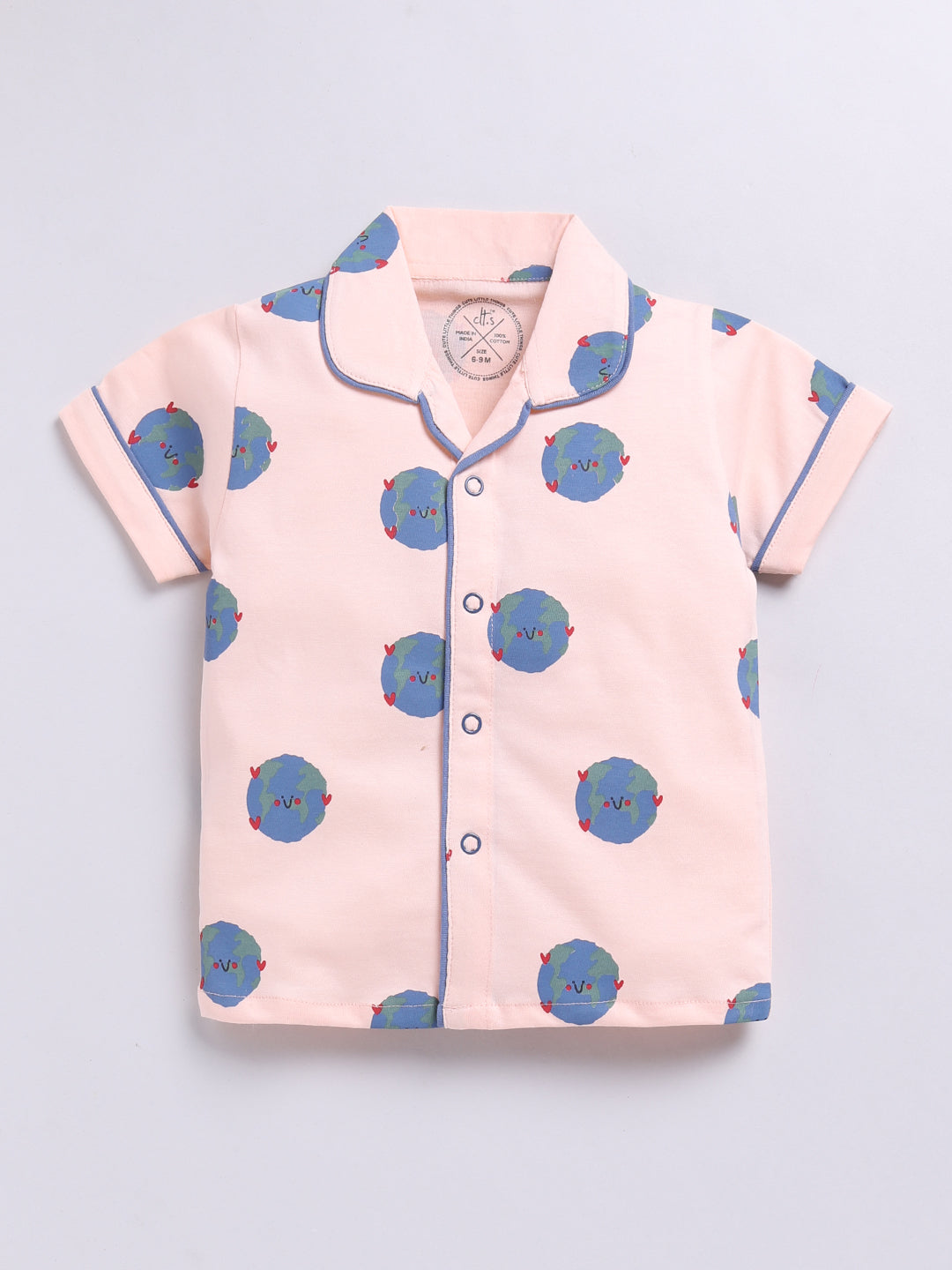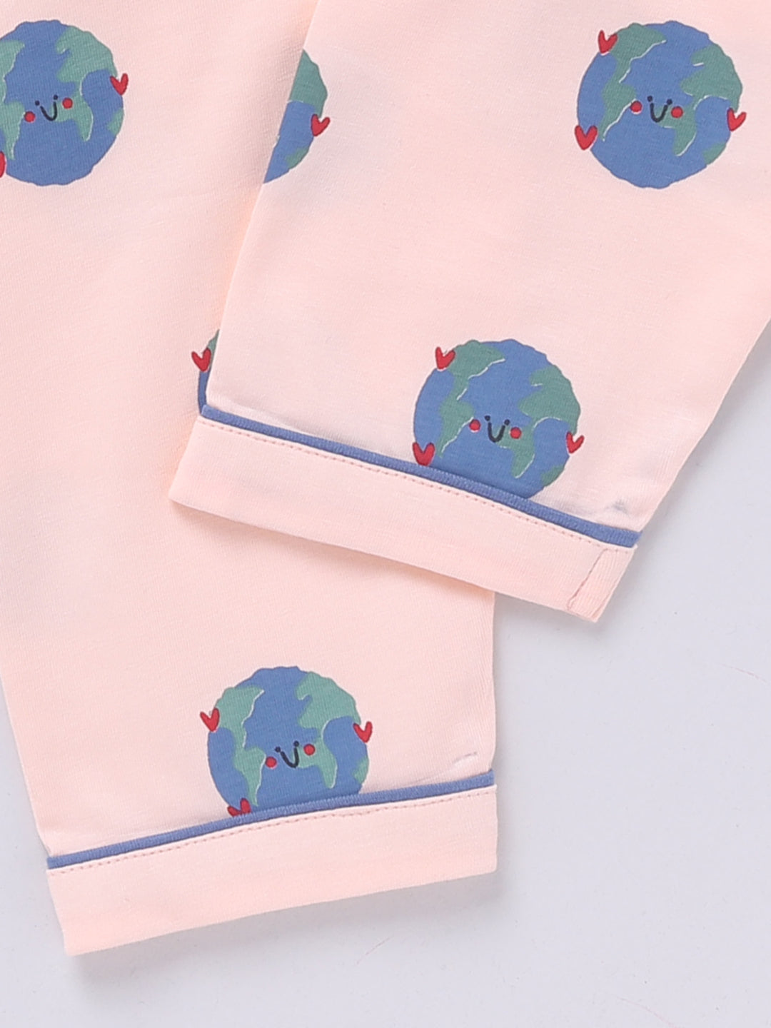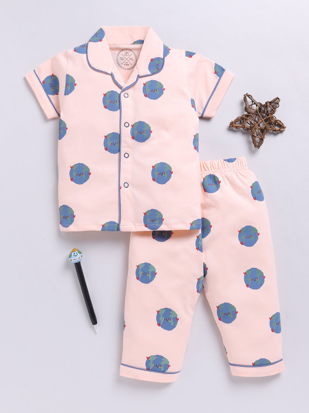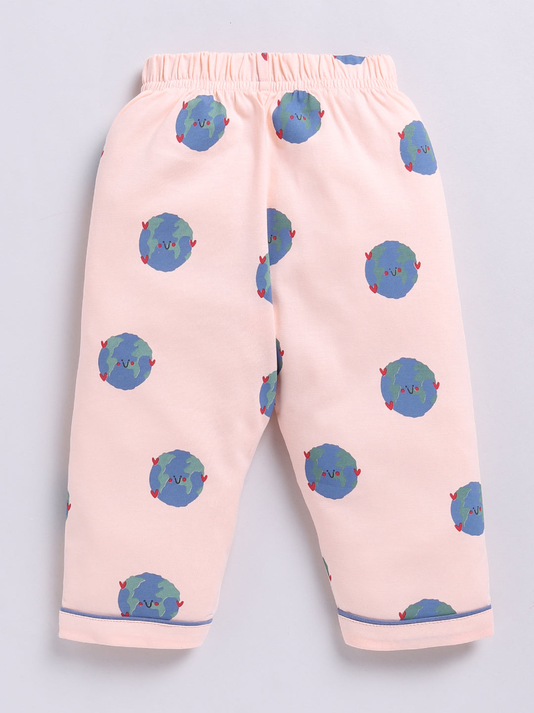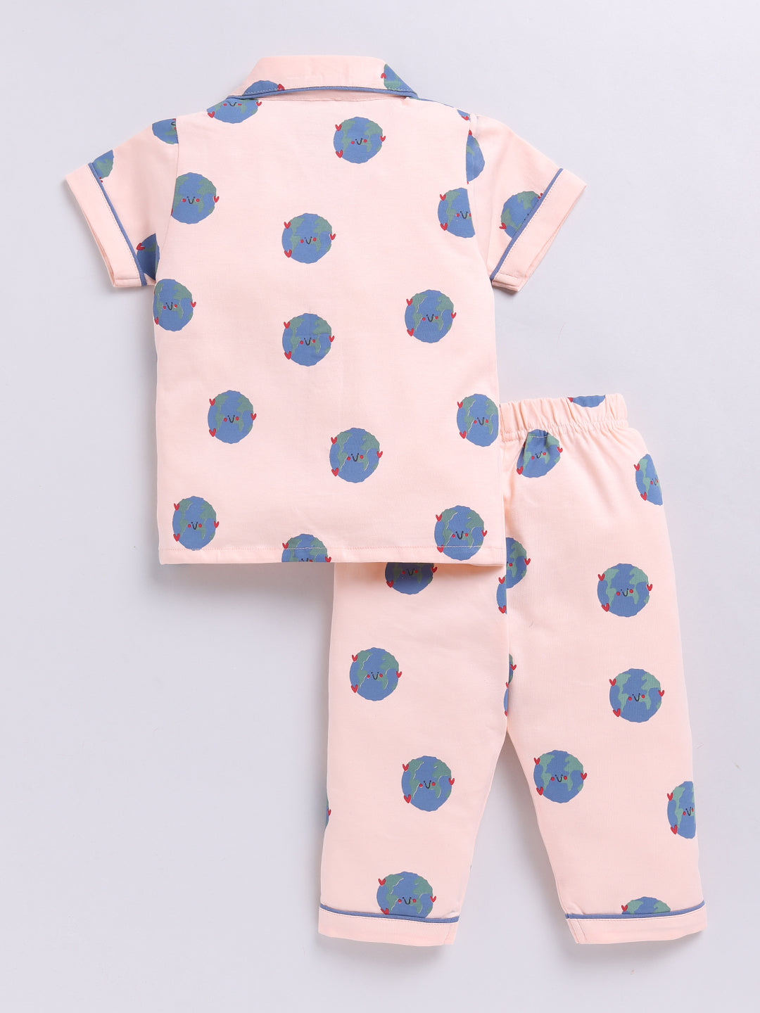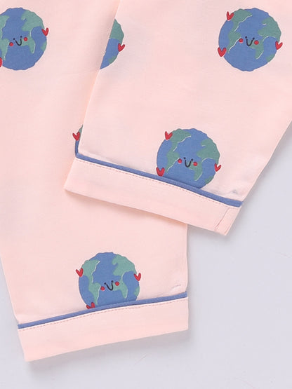 Planets Peach Cotton Half Sleeves Nightwear Set